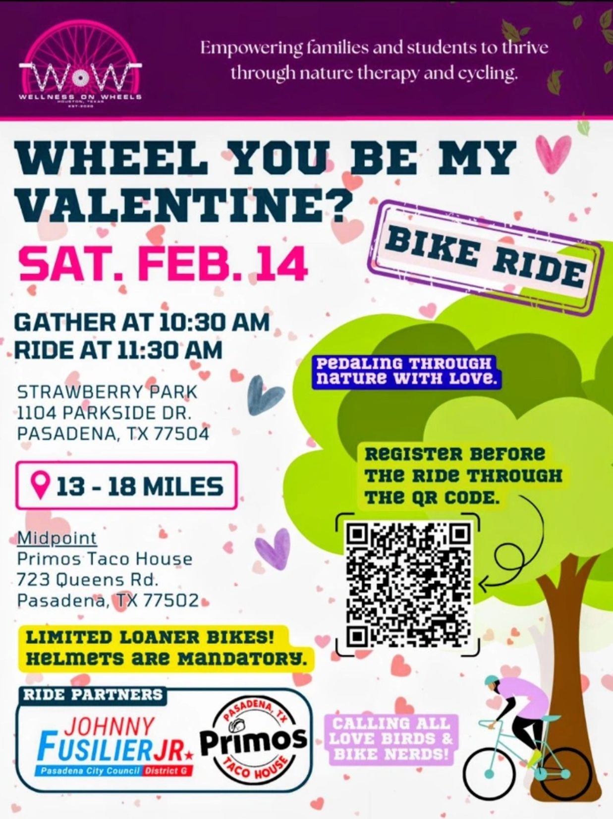 W.O.W. creates cycling opportunities, and often other outdoor activities included, for individuals and groups to enjoy being in nature and community. W.O.W. participates in rides hosted by organizations around the community such as the Tour de Houston, Ft. Bend County DA Ride for Survivors, The Arc Ride for Autism, and The Gator Ride in Baytown.